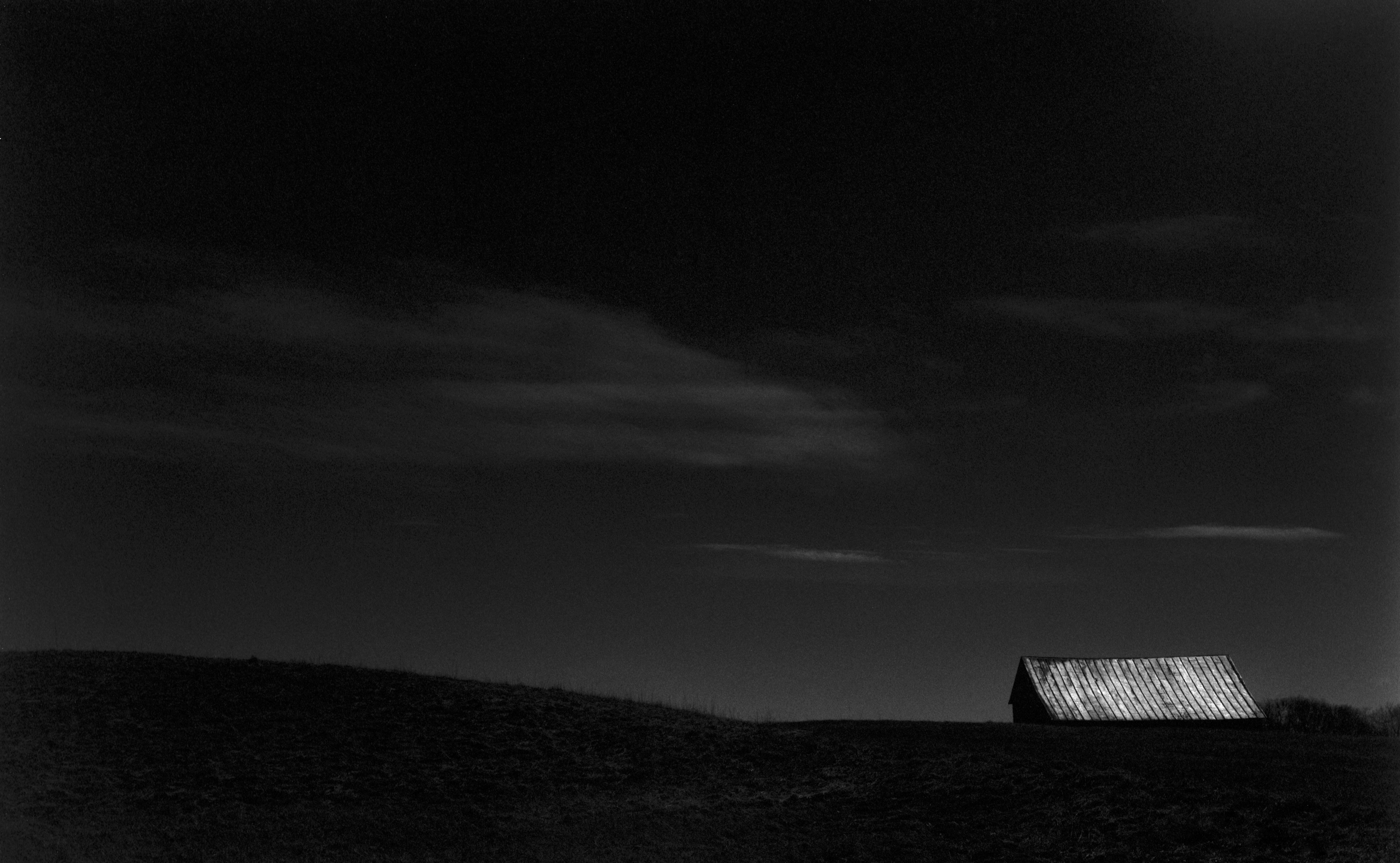 I’d spent the day photographing with film cameras and, because the sun had gone down, was driving toward home when I saw this barn lit by moonlight. There wasn’t enough light to hand-hold the smaller camera, so I got out the 4×5 view camera. In the time it took to fix the camera to the tripod and open the shutter, the highlights on the roof of the barn had diminished because the moon had moved. Even with my head under the dark cloth I could barely see enough of the barn’s roof to focus.