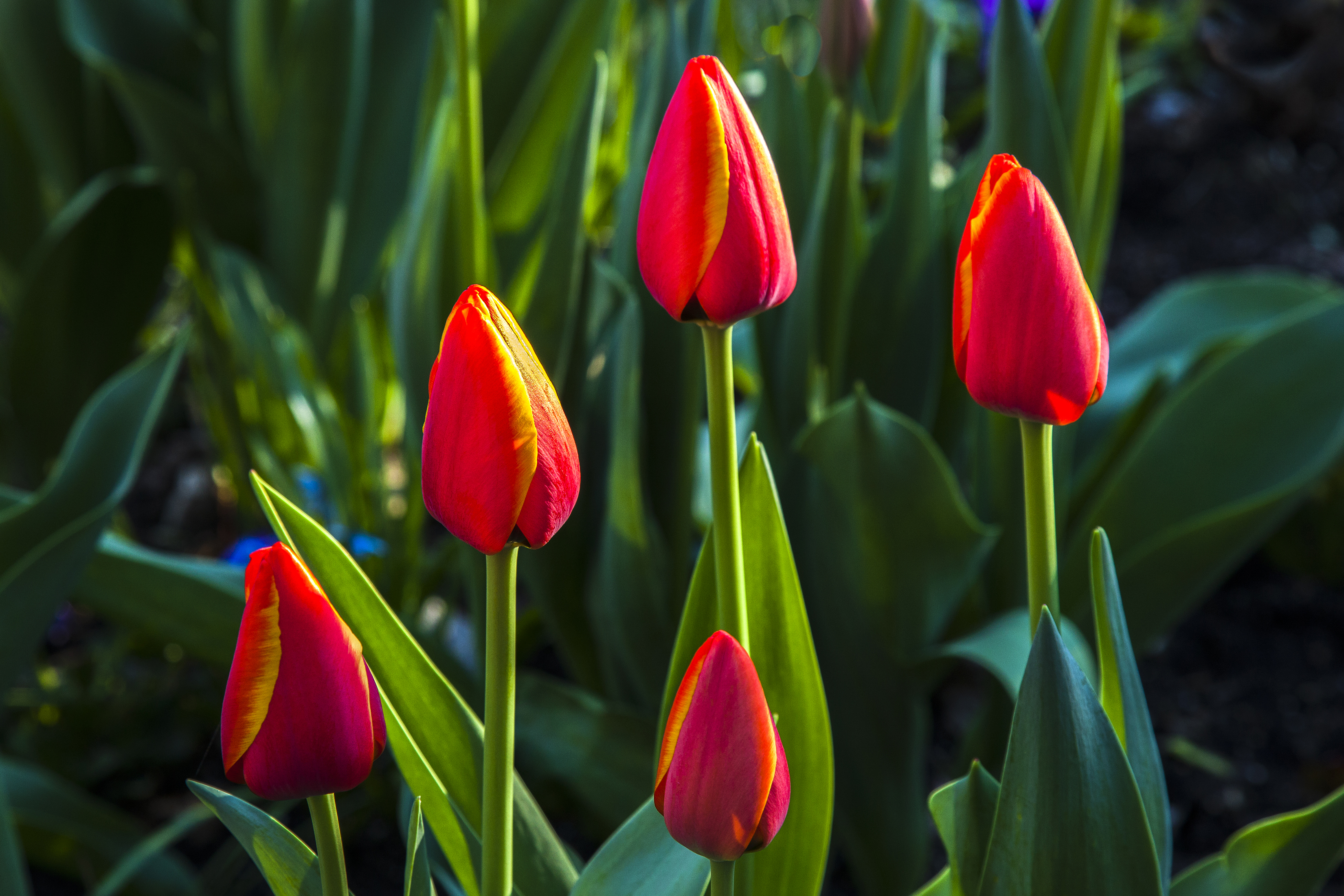 I was surprised to learn that tulips are originally from Persia. They were brought to the Netherlands in the 17th century. The name comes from the word turban or “taliban,” the wraparound headdress worn by many Middle Eastern people. In Latin, it translates to “tulipa.” The flowers pictured here are a hybrid known as “World’s Favorite.” Linda planted the bulbs in the Fall, and when they came up in early April, she and I were stunned by their beauty. The picture in the catalog she purchased them from didn’t do justice to the reality. I couldn’t go past our kitchen window without looking out to admire them. One morning when the sun raked across the crimson and yellow heads with the leaves not yet fully illuminated I planned to photograph them the next day. I sat on a cushion to get the low angle but it was worth it.