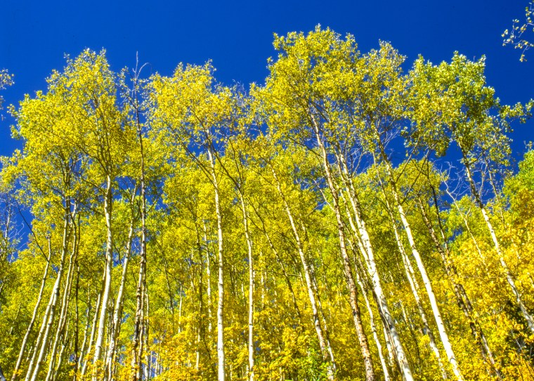 Aspen trees grow 24 inches per year to a height of 50 feet or more. Because they grow in stands (called clones) and reproduce by sending up sprouts—individual trees—from their roots, they’re the largest living organism on the planet. Virtually all the trees in a clone are connected, so while the lifespan of an individual tree is normally 100–150 years these days, there’s a clone in Minnesota that has been estimated to be 8,000 years old. And in Fishlake National Forest, Utah, there’s a clone of interconnected aspen roots that researchers consider to be a single tree with one massive underground root system over 80,000 years old covering more than 100 acres and resulting in a forest of approximately 47,000 individual trunks.