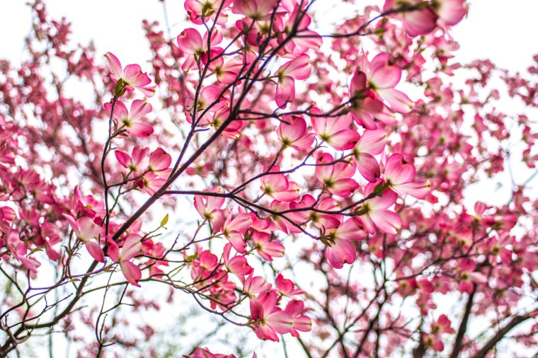 The pink variety of flowering dogwood was first noticed and recorded by plant hunter Marc Catesby in 1731. The tree grows to a height of around 25 feet with a spread of around 25 feet at maturity, gaining a height increase of 13–24 inches per year. Flowers open in mid-spring, showing four large bracts that are incorrectly labeled as petals. Trees grown in the wild always have white bracts, but those propagated for sale can have white, pink or red bracts.