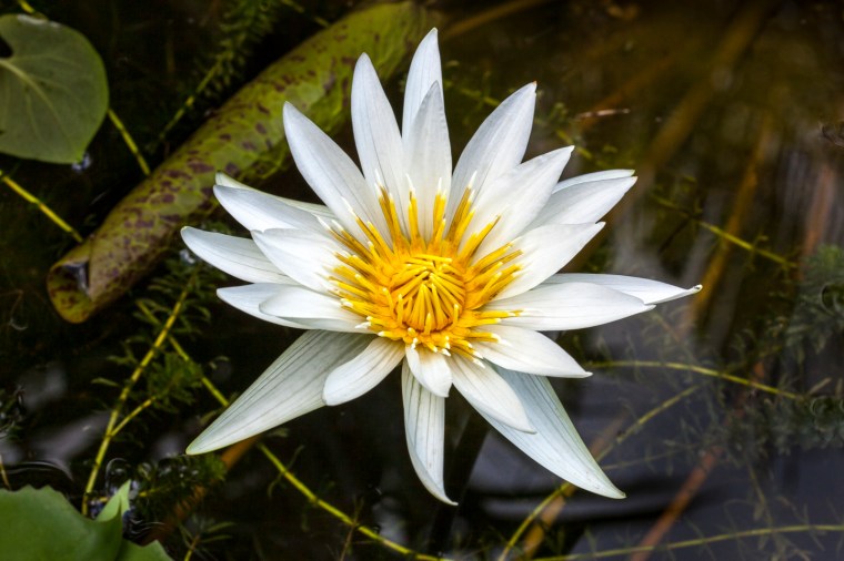The white water lily common to North America is the fragrant Nymphaea odorata. The flower blooms in the daylight and gently close at night. Its commercial appeal has made it an “invader” that multiplies so quickly it can destabilize underwater ecosystems—natural ponds, rivers, lakes—posing a risk to native species.