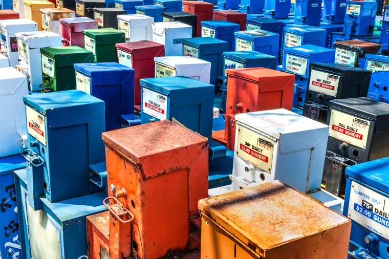 These retired coin-operated newspaper boxes call to mind two fundamental principals in the science of whole systems. The first is “entropy,” a term borrowed from the second law of thermodynamics in physics. It describes the process whereby matter gradually dissipates or declines into a state of disorder. Throughout the universe, entropy always and inevitably increases with time.