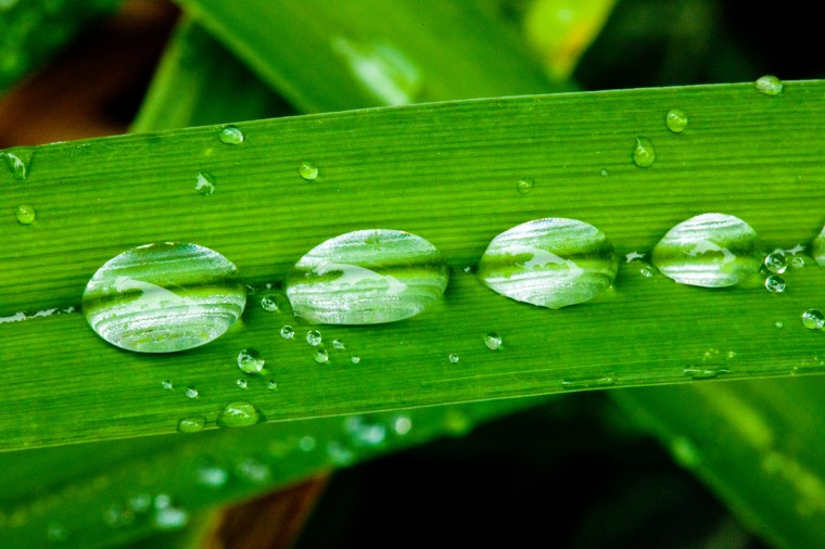 The drops in this image didn’t land on the leaf and line up this way. Their sizes and alignments are a product of their travels, conditioned by the physical forces and electrical fields they encountered along the way. And the continue to change state, evaporating back into the atmosphere. In the liquid state, drops of water assume a rounded shape because a sphere requires the least amount of energy to form and has the least possible area for the volume it encloses. That makes it the most economical, energy-efficient way of enclosing and separating two volumes of space—water and surface. Aside from the physics, I love the aesthetics—how the drops are transparent and reflect the sky. Earth and sky integrated as one.